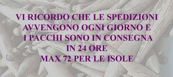 Dalla partenza del pacco, consegna in 24/48 ore, 72 ore per le isole. Tutti i pacchi vengono forniti con scontrino fiscale. Spedizione con Corriere Express GLS, dal lunedì al venerdì.