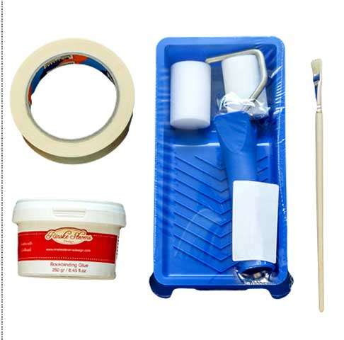 Il kit contiene: 1 confezione colla da 250gr, 1 vaschetta, 1 rullo con manico, 1 rullino ricambio, 1 nastro carta.
