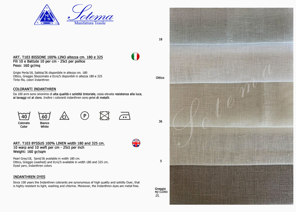 Lino t103 (10×10 fili) sotema H cm 180 COLORI NUOVI € 44,00 al metro, vendita a multipli di 50 cm